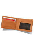 A 100% genuine leather wallet with embossed interior. Features easy access currency sleeve, mesh ID window, and custom metal logo rivet at front.