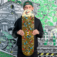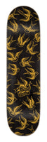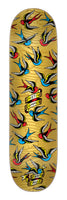Santa Cruz Skateboards Justin Sommer Sparrows Pro deck featuring spot gloss raised ink graphic with gold foil and metallic gold print on 7 ply North American Maple pressed individually using epoxy making a strong, responsive deck with long lasting pop and consistent concave and kick.