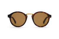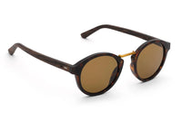 Extravagance: The wooden sunglasses Feronia 2.0 comes with a round frame made of TR-90 in Havana style. A golden metal bridge connects the two frame elements and sets a visual highlight. Brown-tinted glasses complement the unique look. Narrow real wood hangers made of brown walnut wood offer excellent support and comfort. This makes Feronia 2.0 feel most comfortable on narrow to medium-wide faces. Feronia 2.0 is supplied in a durable cardboard folding case including a microfiber cleaning cloth.