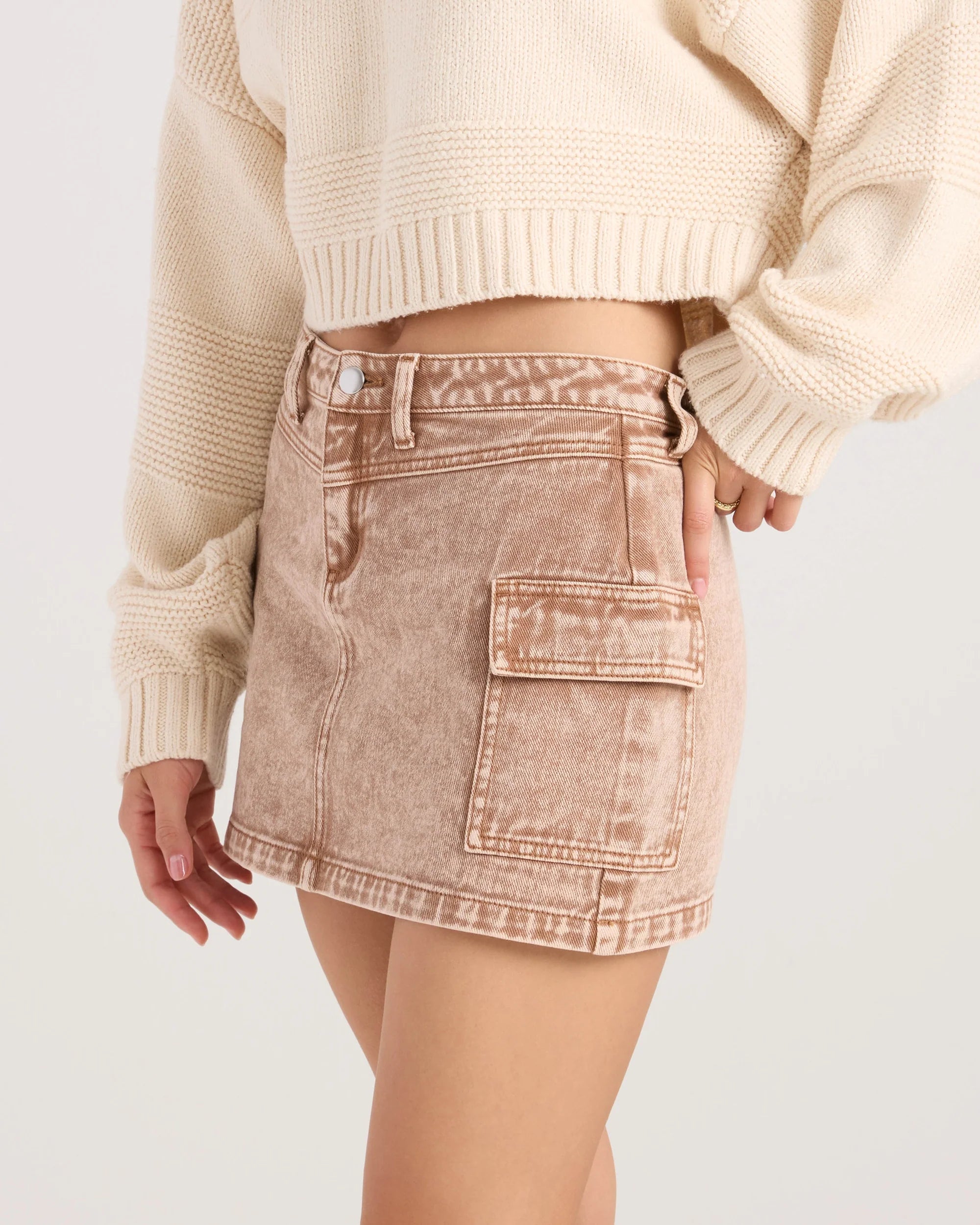 Pockets on a mini? Now we're talking. The Delia Cargo Mini Skirt brings a high-waisted fit in washed henna denim with a 14-inch outseam, front fly zip, and patch cargo pocketing for real carry. Visible stitching and a clean front seam nod to utility, turning everyday missions into low-key statements.